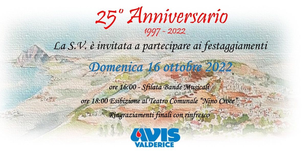 In occasione del 25° anniversario della costituzione dell’ AVIS VALDERICE ti invitiamo a partecipare ai festeggiamenti insieme alla tua famiglia Domenica 16 Ottobre tra le vie del nostro paese ore 16,00 inizio sfilata delle bande con il seguente itinerario: Piazza Cristo Re, Via Vespri direzione Trapani, Via Sabaudia, Via della Repubblica, Via Vespri, Via San Barnaba fino all’anfiteatro con concerto finale delle bande stesse. A seguire un rinfresco.