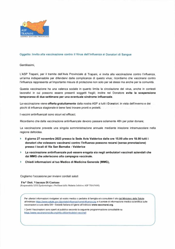 Invito alla vaccinazione contro il Virus dell’influenza ai Donatori Sangue